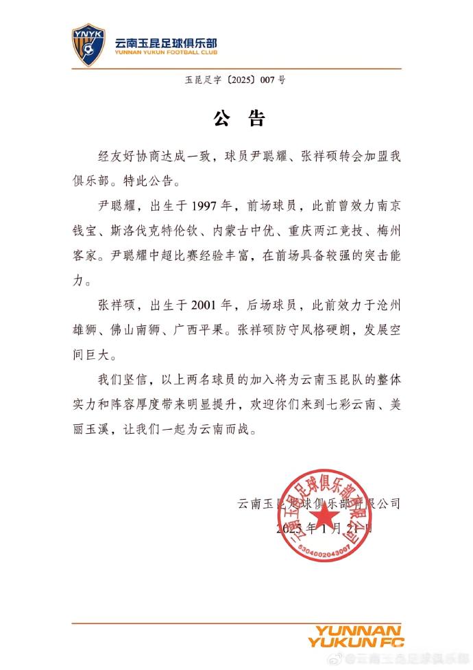 1月21日,云南玉昆足球俱乐部官方发布公告,球员尹聪耀、张祥硕转会加盟球队。