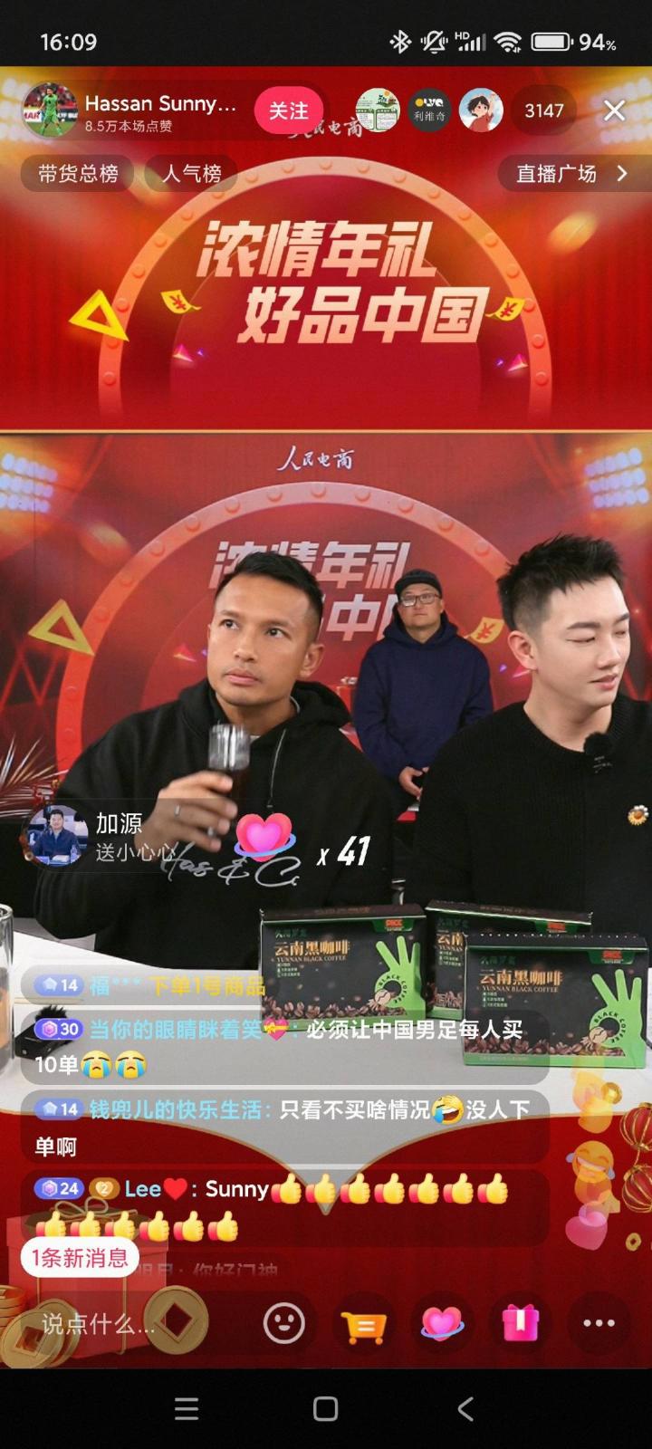 可以看到,本场直播有3147名观众,有8.5万点赞,而哈桑-桑尼正在销售的产品是黑咖啡。