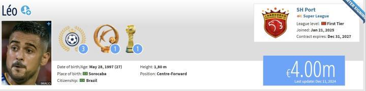 德国转会市场网站确认,山东泰山前锋莱昂纳多加盟上海海港。