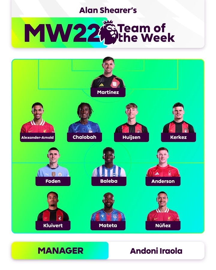 北京时间1月21日,英超官方发布了传奇射手阿兰-希勒所评选的英超第22轮最佳阵容,由努涅斯和福登领衔,伯恩茅斯三名球员入选,最佳主教练为伊劳拉。