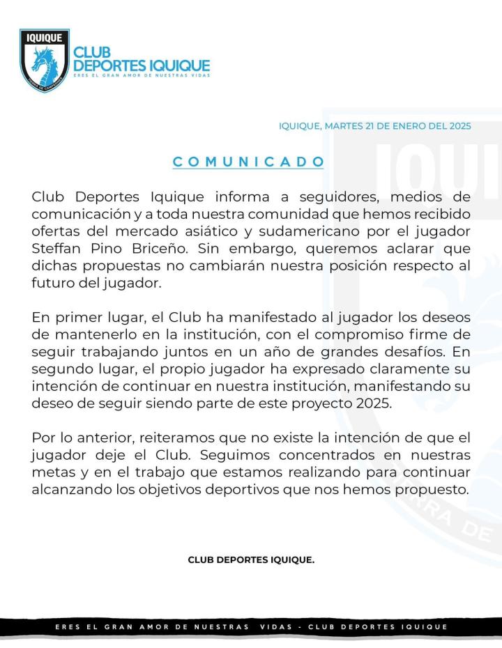 伊基克俱乐部向球迷、媒体和我们整个社区通报,我们已经收到了来自亚洲和南美市场对球员皮诺的报价。然而,我们想澄清,这些报价不会改变我们对该球员未来的立场。