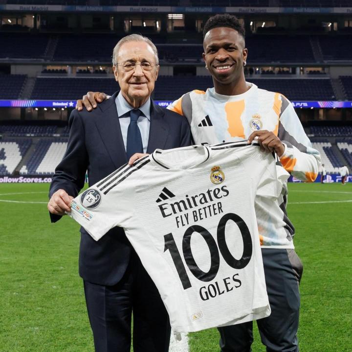 在与萨尔茨堡红牛的比赛中打入两球后,维尼修斯达成皇马生涯百球里程碑,赛后,维尼修斯更新社交媒体庆祝这一特殊时刻。