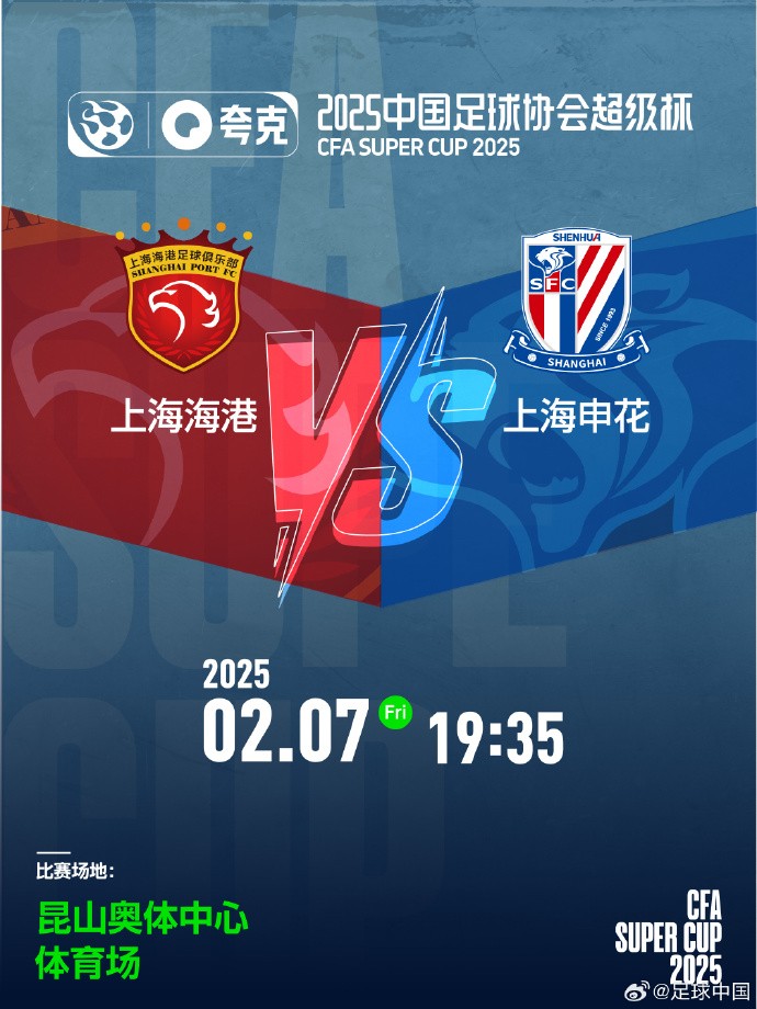 北京时间2月7日19:35,中国足球协会超级杯,上赛季中超联赛与足协杯冠军上海上港将迎战上赛季中超联赛亚军上海申花。