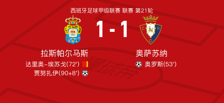 北京时间1月25日拉斯帕尔马斯vs奥萨苏纳,贾努扎伊得到全场最高的7.9分,鲁文-佩尼亚得到全场最低的6.2分