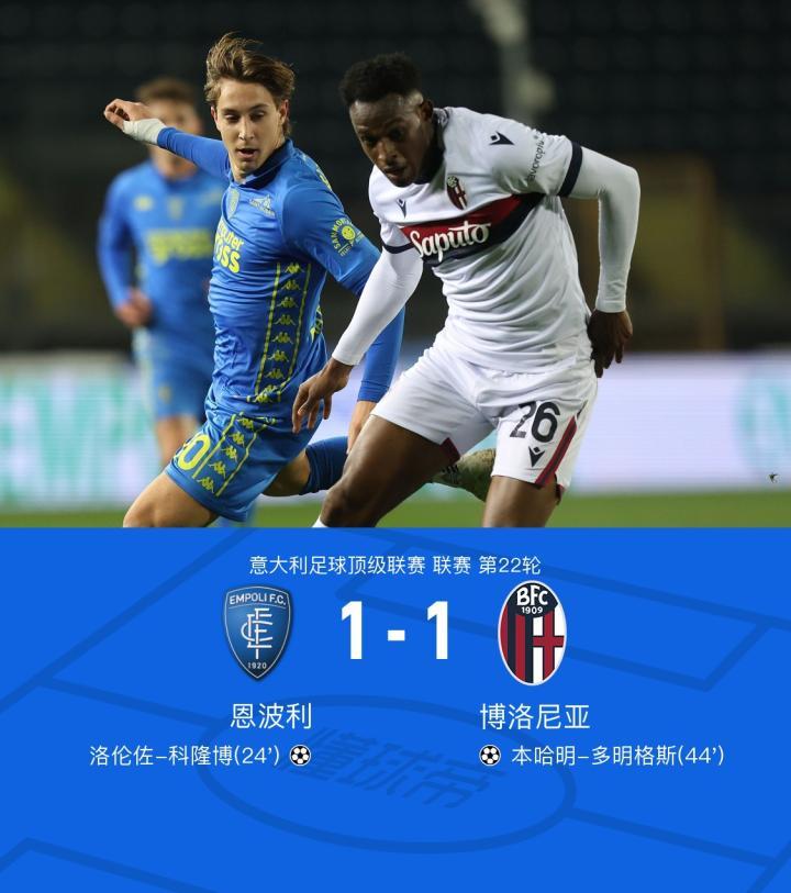 恩波利1-1博洛尼亚连续7轮不胜,科隆博破门,多明格斯扳平