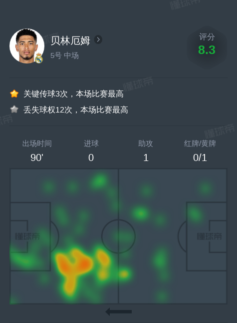 北京时间1月26日巴拉多利德vs皇家马德里,贝林厄姆1助攻,3次关键传球,3次射门,2次成功过人。