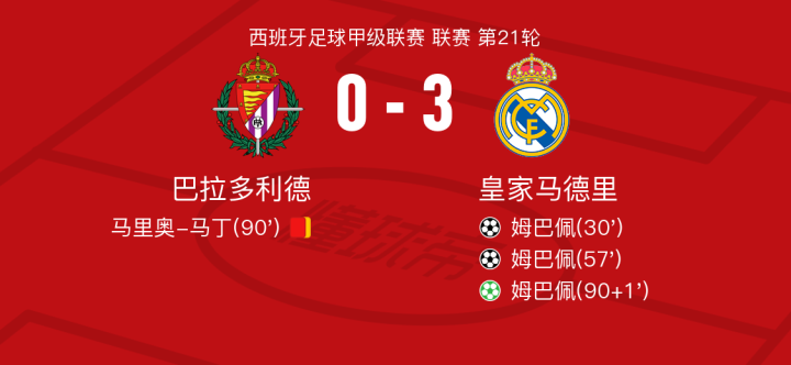 北京时间1月26日巴拉多利德vs皇家马德里,姆巴佩得到全场最高的9.8分,阿瓜多得到全场最低的5.6分