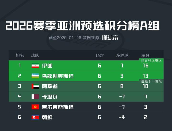 目前,乌兹别克斯坦在18强赛中排名A组第二,落后第一的伊朗3分,领先第三的阿联酋3分。