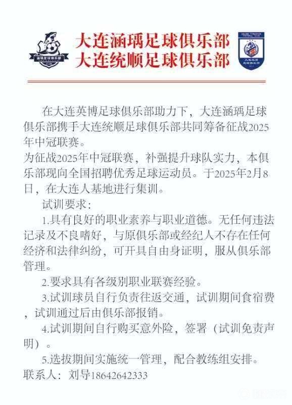 为征战2025年中冠联赛,补强提升球队实力,本俱乐部现向全国招聘优秀足球运动员。于2025年2月8日,在大连人基地进行集训。