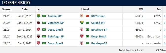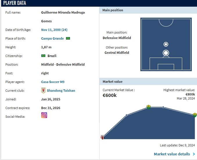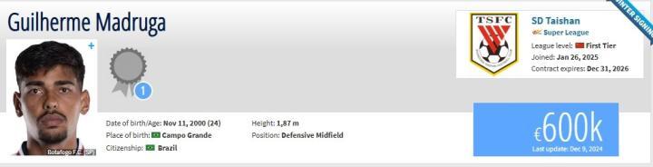 德转更新,巴西中场马德鲁加转会山东泰山,转会费为76.2万欧。