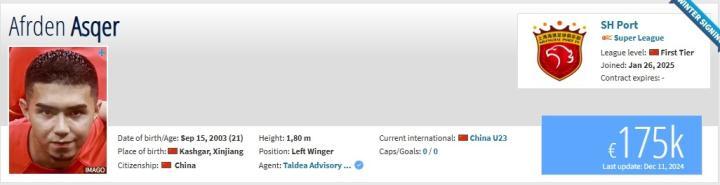 德转显示,艾菲尔丁加盟上海海港的方式为自由身加盟,目前球员的身价为17.5万欧。