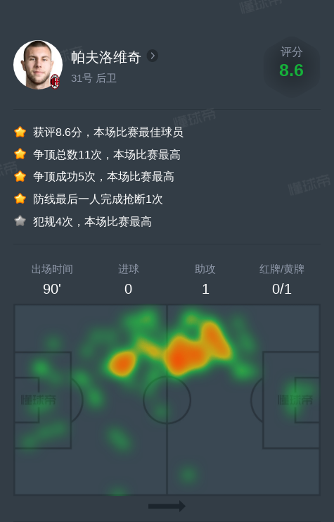 北京时间1月26日AC米兰vs帕尔马,帕夫洛维奇1助攻,2次关键传球,1次射门。
