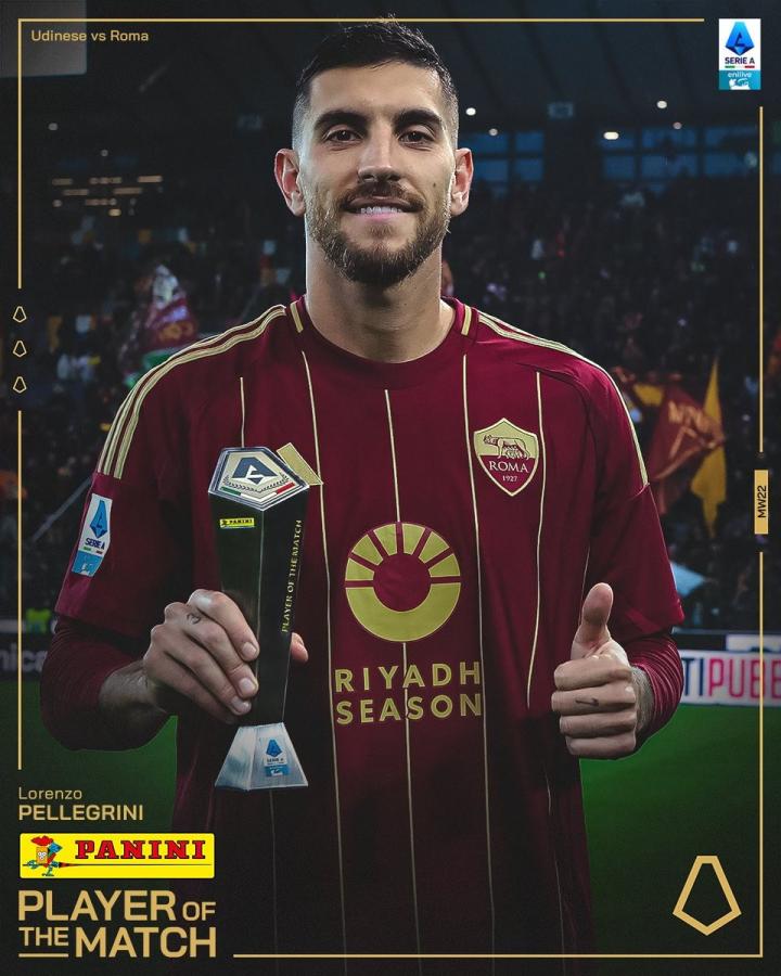 北京时间1月27日,在意甲第22轮罗马客场2-1战胜乌迪内斯,近6轮4胜2平保持不败之后,此战打进一粒点球的洛伦佐-佩莱格里尼被意甲官方评为了本场比赛的最佳球员。