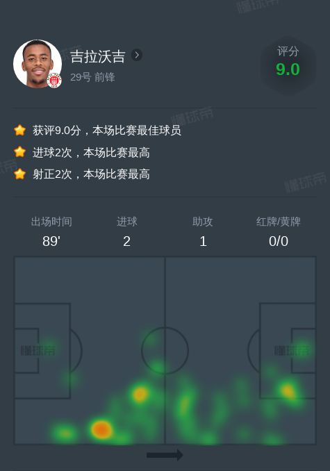 北京时间1月27日圣保利vs柏林联合,吉拉沃吉贡献2球,1助攻,2次关键传球,2次射门。