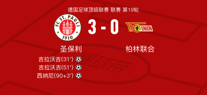北京时间1月27日圣保利vs柏林联合,吉拉沃吉得到全场最高的9.0分,斯科特-班克斯得到全场最低的5.9分