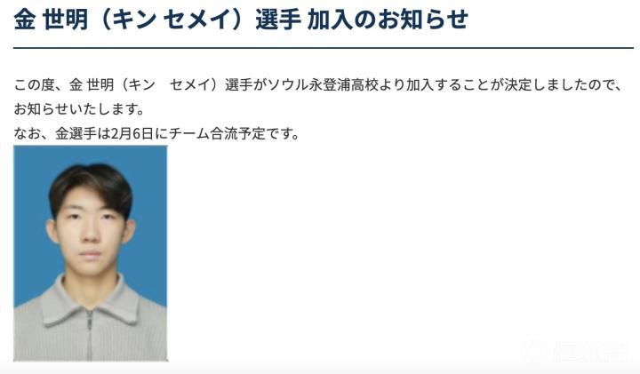 官方表示:金世明选手将从首尔的永登浦高中加盟鸟取飞翔,球员将在2月6日与球队会合,特此通知。