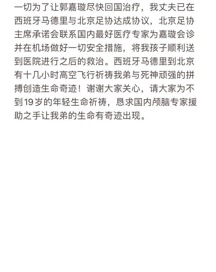 郭嘉璇母亲发布的图片写道:“一切为了让郭嘉璇尽快回国治疗,我丈夫已在西班牙马德里与北京足协达成协议,北京足协主席承诺会联系国内最好医疗专家为嘉璇会诊并在机场做好一切安全措施,将我孩子顺利送到医院进行之后的救治。