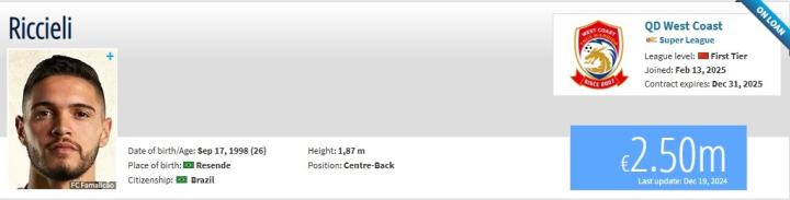 德转更新,葡超法马利康队长后卫里切利租借加盟青岛西海岸,租借期为1年,球员身价250万欧元。
