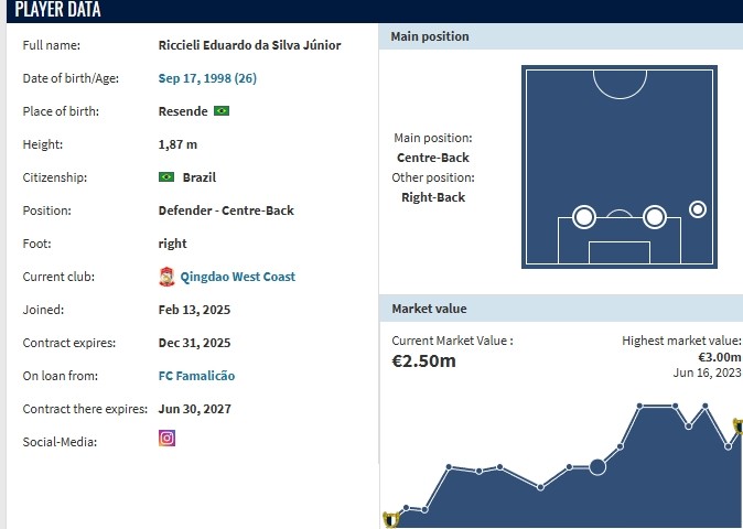 里切利现年26岁,来自巴西,司职后卫,租借加盟青岛西海岸前担任葡超球队法马利康队长。截至目前,里切利共为法马利康在各项赛事出场161次,打进7球助攻1次。
