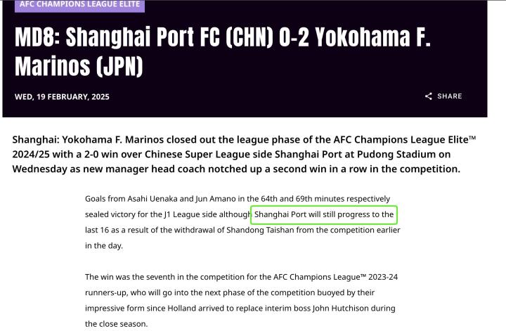 北京时间2月19日,上海海港主场不敌横滨水手,但赛后亚足联官网的战报中表示,上海海港仍旧将晋级16强。