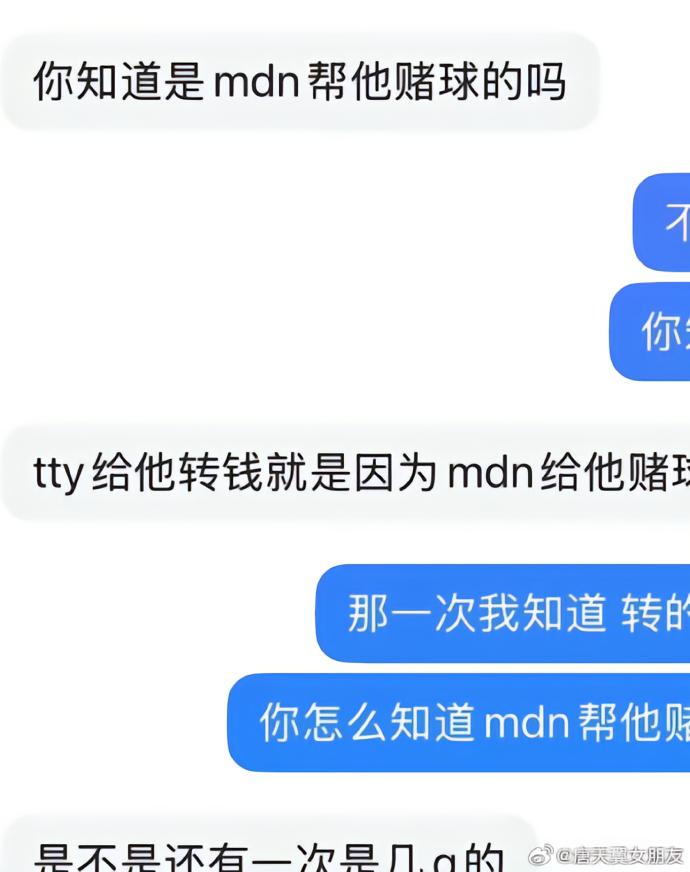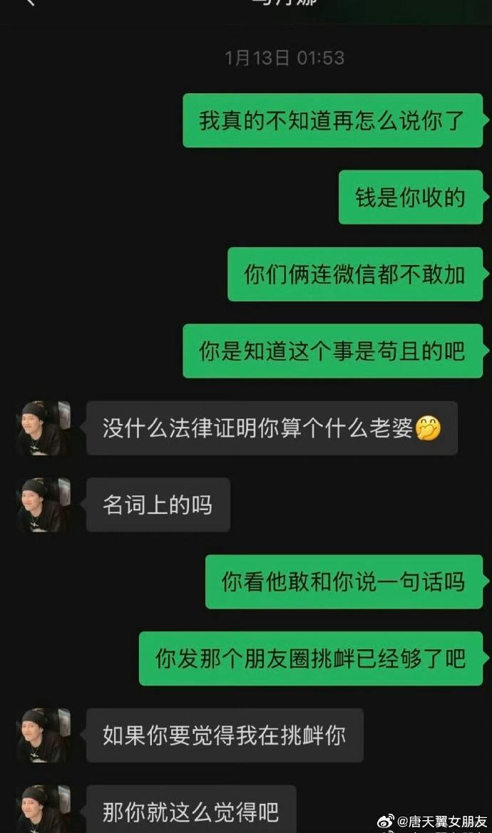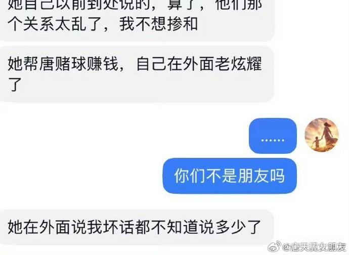 2月20日晚,ID名为“唐天翼女朋友”的用户再次发声,痛斥一位女子是她和唐天翼之间的小三,还和唐天翼一起赌球。