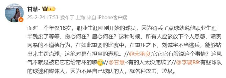 记者甘慧回复道:“面对一个年仅18岁,职业生涯刚刚开始的球员,因为罚丢了点球就说他职业生涯半残废了等等,良心何在?居心何在?这种时候,所有人应该放下个人恩怨,谴责网暴的不道德行为。在如此重要的比赛中,在重压之下,刘诚宇不当逃兵,能够站出来主罚点球,这绝对是有担当的表现。”