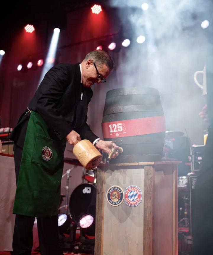 随后,拜仁CEO德雷森敲开了有125年历史的啤酒桶——但希望这酒没那么老。