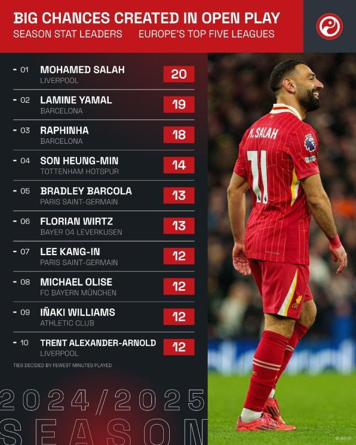 足球数据博主Squawka发布了本赛季五大联赛运动战创造绝佳机会次数排行榜,萨拉赫以20次居首,亚马尔第二,孙兴慜和李刚仁两名韩国球员位列前十。