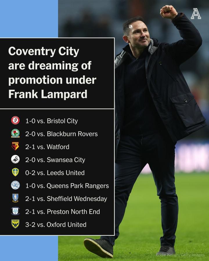 赛后根据统计,在兰帕德去年11月接手时,他们仅仅位列英冠积分榜的第17位,如今在近9轮取胜8场之后,他们已经升至第5,直接进入了升级附加赛区。
