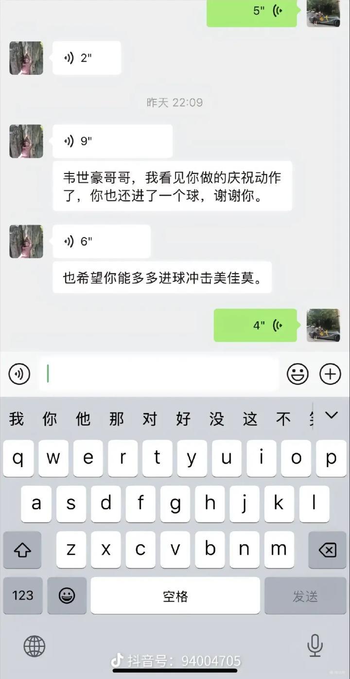 韦世豪在社交媒体上晒出了自己与林子金的聊天记录,林子金在微信里说:韦世豪哥哥,我看见你做的庆祝动作了,你还进了一个球,谢谢你。