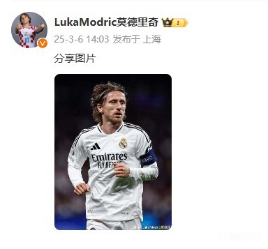 今天,莫德里奇的微博更新了动态,晒出了球员在马德里德比当中的比赛图,值得一提的是,IP显示这是在上海发布的。