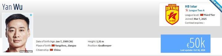 德转更新,36岁前河南、大连人门将吴龑复出,加盟湖北青年星。