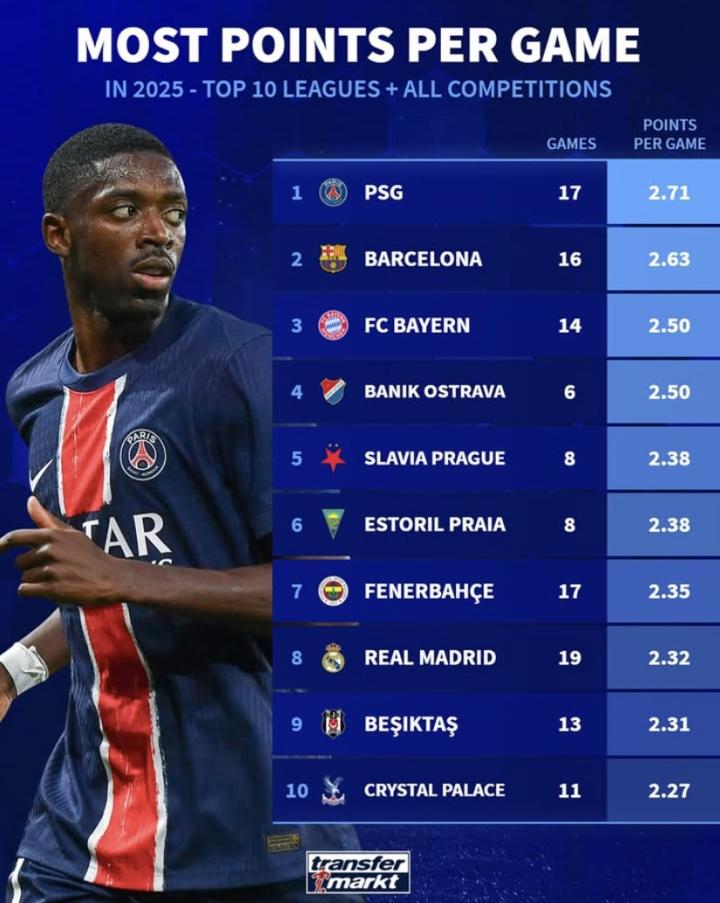 北京时间3月8日,德国转会市场列出了2025年欧洲前十联赛球队场均得分榜。