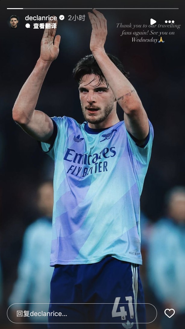 北京时间3月10日凌晨,英超联赛第28轮,阿森纳在客场1-1战平曼联。在本场比赛中,赖斯打进了扳平比分的进球。赛后,球员更新了个人社媒。