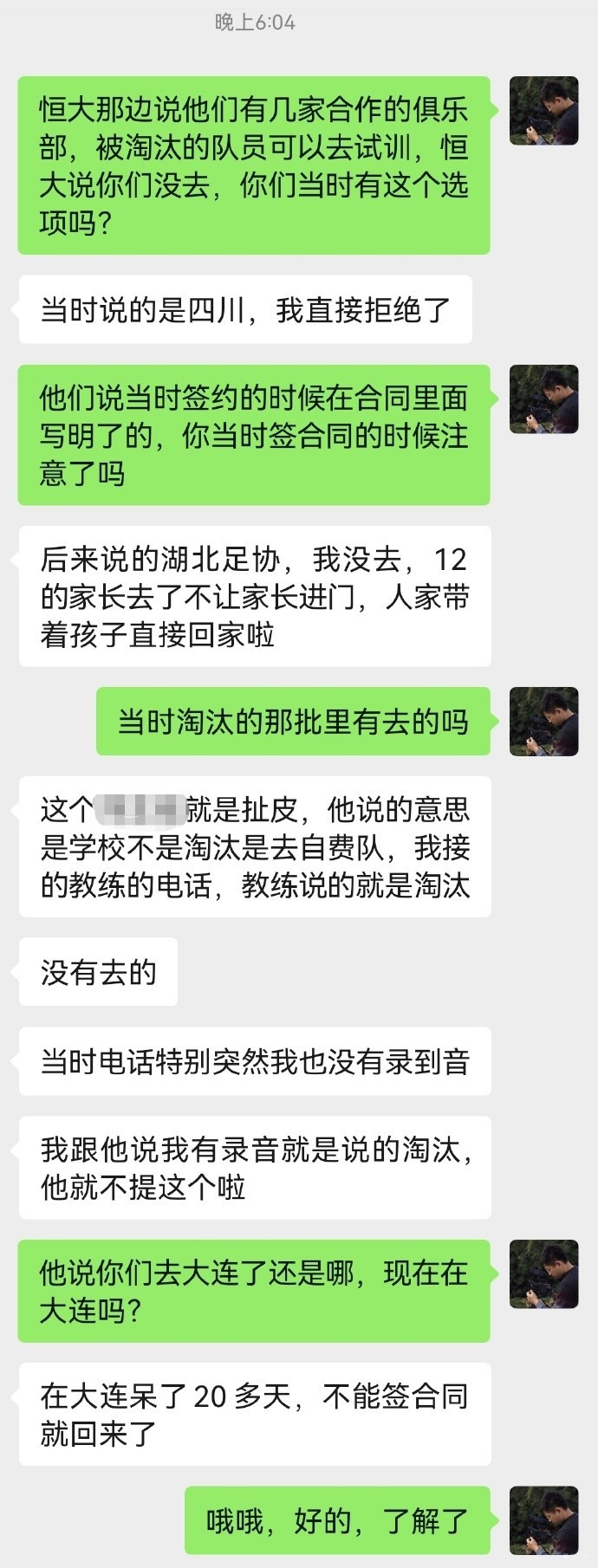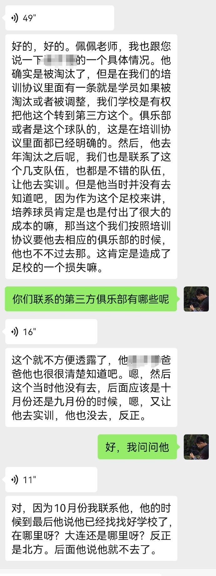 随后,该博主又晒出了一段后续,有不同的说法,后续聊天记录中表示:他确实是被淘汰了,但是在我们的培训协议里面有一条就是学员如果被淘汰或者被调整,我们学校是有权把他这个转到第三方俱乐部或者球队的,这是在培训协议里面都已经明确的。然后,他去年淘汰之后,我们也是联系了这个几支队伍,也都是不错的队伍,让他去试训。但是他当时并没有去,因为作为足校来讲,培养球员肯定也是付出了很大的成本,那当这个我们按照培训协议要他去相应的俱乐部的时候他也不过去。这肯定是造成了足校的一个损失嘛。