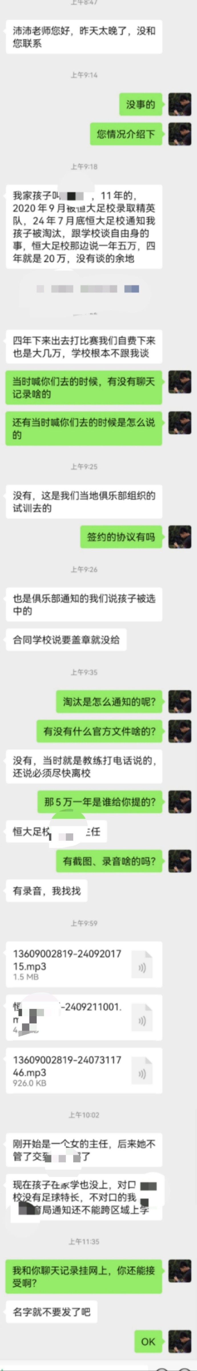 该家长表示:自己的孩子是11年的,2020年9月被恒大足校录取进入精英队,24年7月底恒大足校通知我孩子被淘汰,跟学校谈自由身的事,恒大足校那边说一年五万,四年就是20万,没有谈的余地。