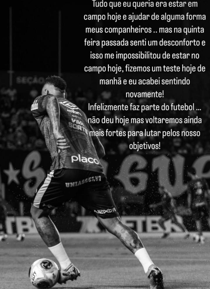 内马尔没有参加桑托斯对阵科林蒂安的比赛,他在个人社交媒体上解释了原因。