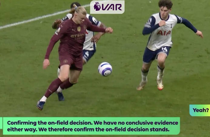 比赛伤停补时阶段,哈兰德与福登进行了一次快速的二过一配合,福登传给哈兰德,后者在接球时手疑似碰了球,然后他突破了热刺的后卫丹索和阿奇-格雷,最终进球。