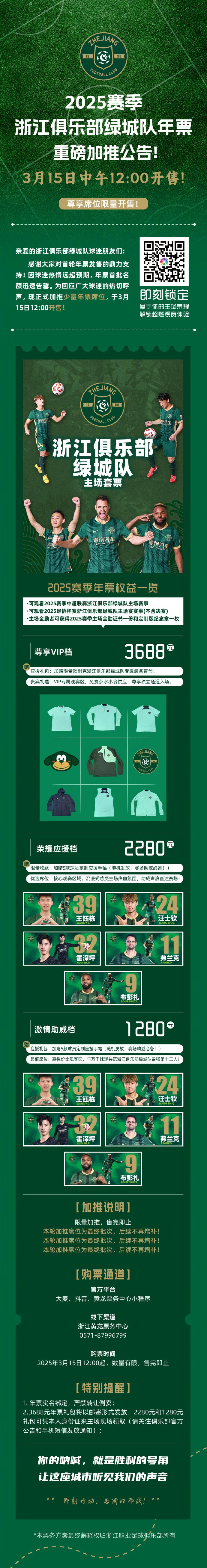 浙江队加推激情助威档(1280元)、荣耀应援档(2280元)、尊享VIP档(3680元)年票。购票时间为3月15日(明日)12:00,数量有限,售完即止。