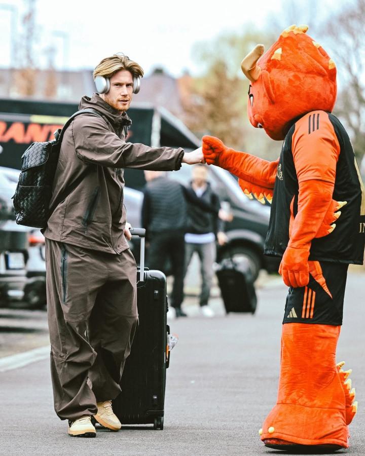 重返国家队的德布劳内在社交媒体晒出他抵达国家队基地后与吉祥物击拳的照片,并配文:“好久不见!😍🇧🇪”