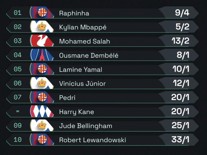 随着国际比赛日的到来,Squawka 更新了金球奖赔率。其中,拉菲尼亚领跑,姆巴佩、萨拉赫前三。
