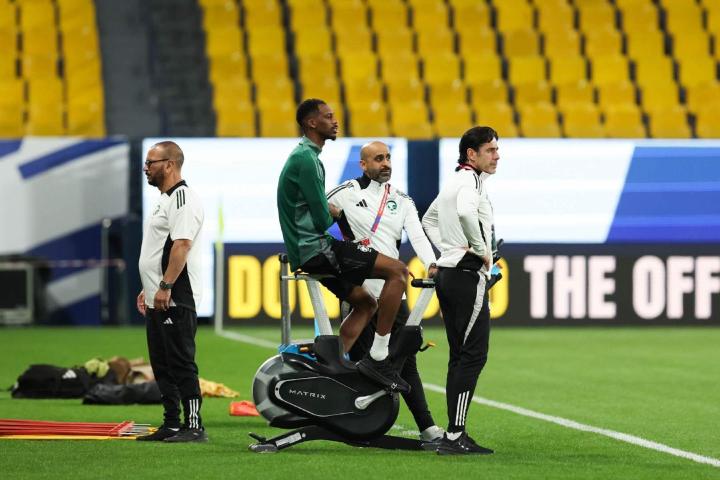 训练开始后,沙特队中场球员穆罕默德-卡努并未加入,而是在场边独自进行着单车训练,进行恢复。