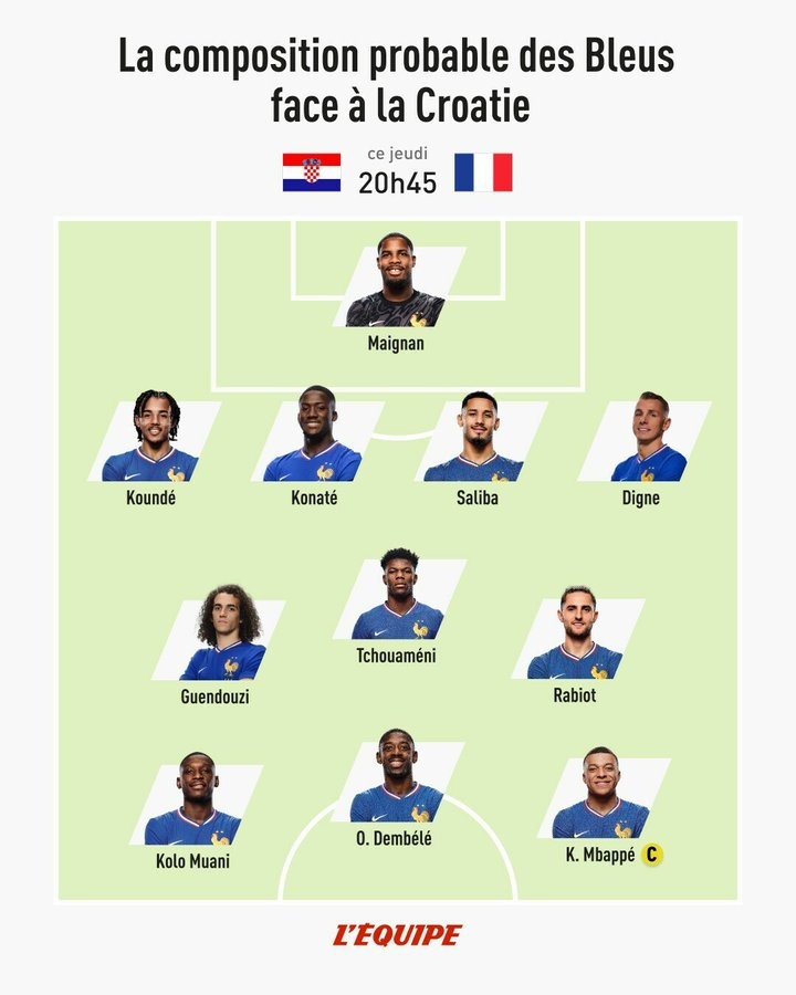 北京时间明天凌晨03:45,法国队将迎来欧国联四分之一决赛首回合客场对阵克罗地亚队的比赛,赛前,《队报》对法国队的首发阵容进行了预测,其中姆巴佩、登贝莱、拉比奥在列。