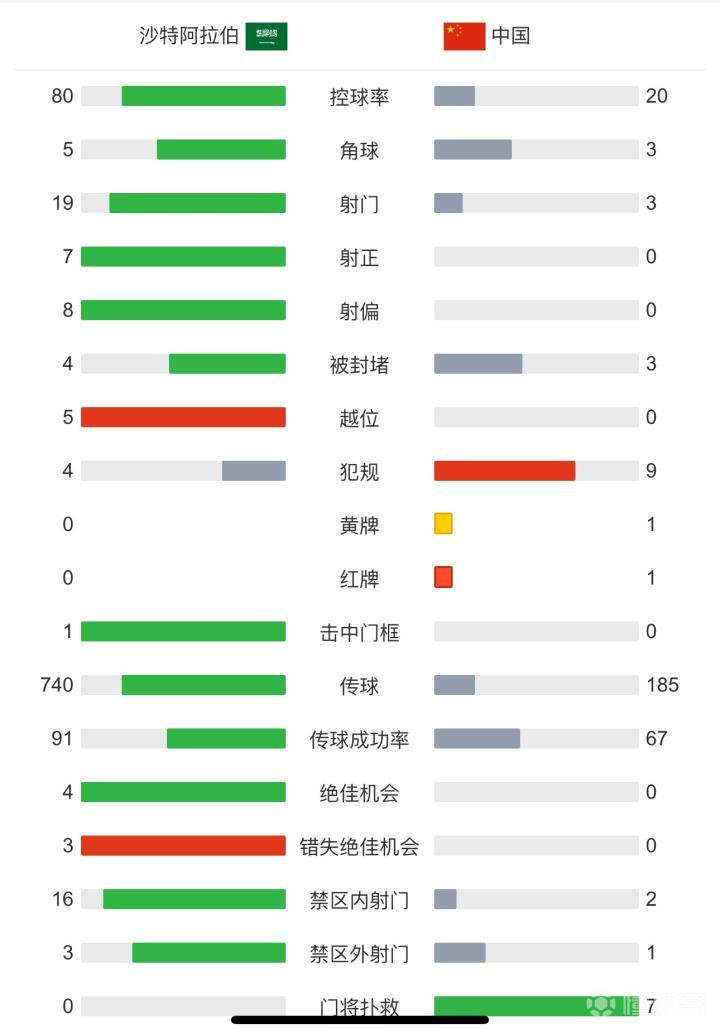 从数据看,此役国足遭遇完败。射门数沙特19比3领先,射正数则为7比0领先。此外,沙特错失了三次绝佳机会。特别是国足本场0射正,表明国足综合实力明显不足,出现红牌后又放大了国足的技术缺陷。
