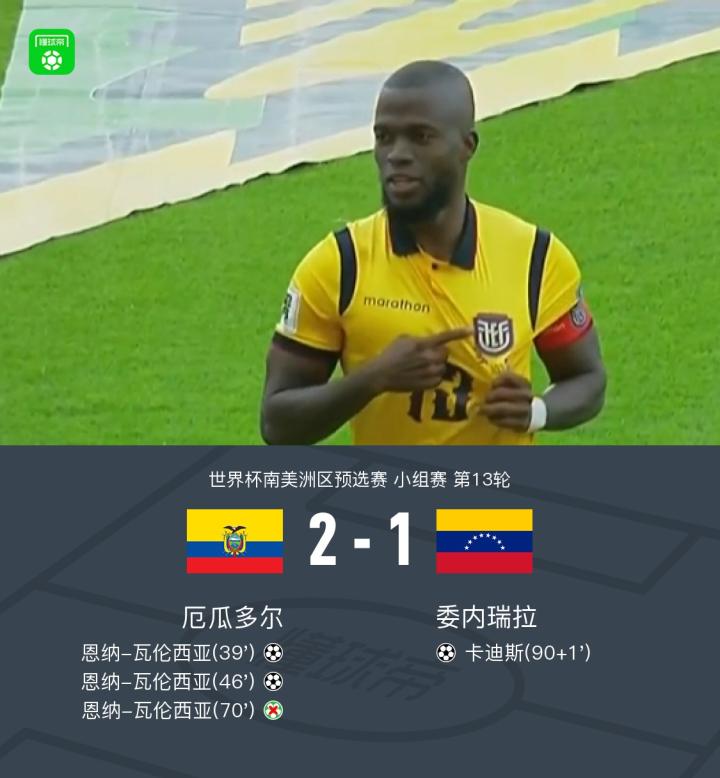 厄瓜多尔2-1委内瑞拉,恩纳-瓦伦西亚双响+丢点,卡迪斯建功