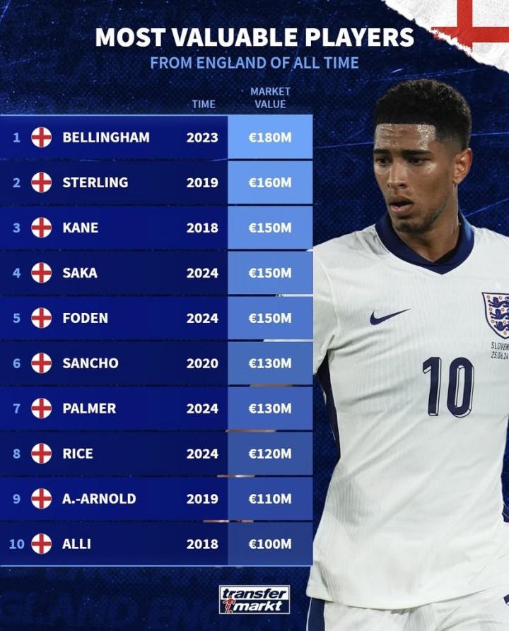 北京时间3月25日,德转统计出了英格兰球员历史身价榜,贝林厄姆以1.8亿欧元高居第一,2019年身价曾达到1.6亿欧元的斯特林排名第二,哈里-凯恩、萨卡以及福登以1.5亿欧元并列第三。