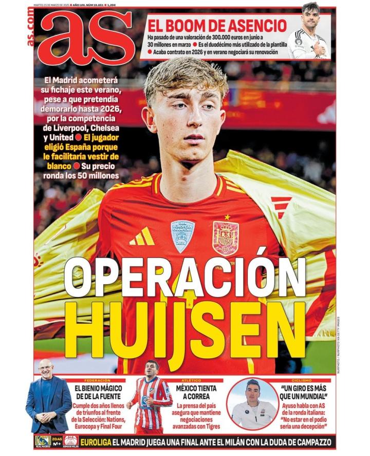 《阿斯报》封面写道,皇家马德里将在今年夏天签下赫伊森,尽管此前他们计划将签约推迟至2026年,计划提前的原因是利物浦、切尔西和曼联的竞争。