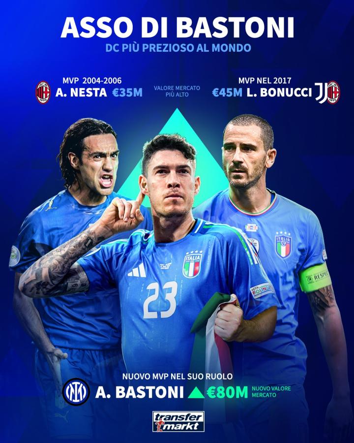在巴斯托尼之前,意大利中卫只有内斯塔(3500万欧,2004年-2006年)和博努奇(4500万欧,2017年)达到这样的高度。