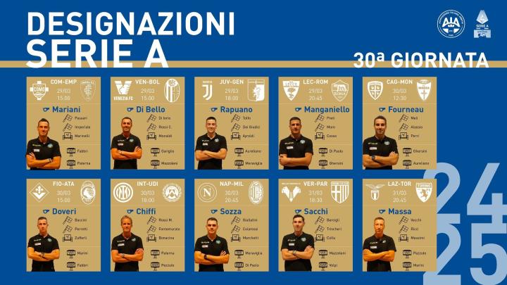 北京时间3月26日,意大利的裁判员协会公布了意甲第30轮的裁判安排,索扎将会执法那不勒斯vsAC米兰,基菲执法国际米兰vs乌迪内斯,拉普阿诺执法尤文图斯vs热那亚。