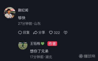 国字号队友蒯纪闻在评论区留言:“够快。”王钰栋回复道:“想你了兄弟。”